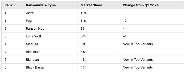 For the sixth consecutive quarter, Akira remained the most common ransomware variant, now tied with Fog, a rapidly emerging strain. These two groups have avoided high-profile attacks on critical infrastructure, allowing them to operate with less scrutiny. Other notable variants in Q4 2024 include RansomHub, Lone Wolf, Medusa, and Black Basta, indicating a shift towards independent actors rather than large Ransomware-as-a-Service (RaaS) groups.