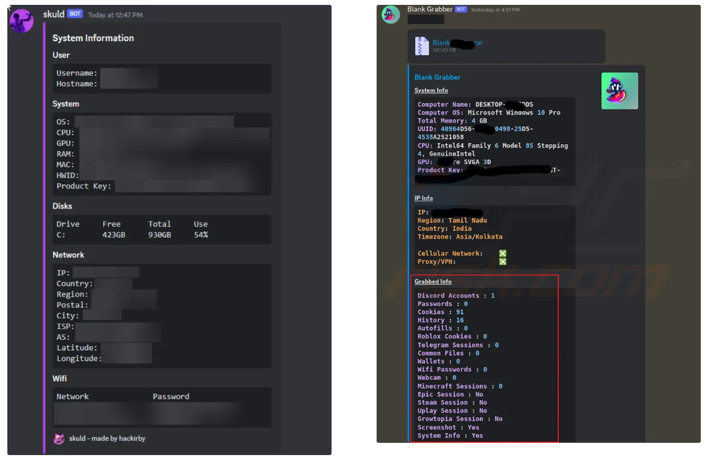 Skuld infostealer on the left and Blank Grabber malware on the right showing credential-stealing capability