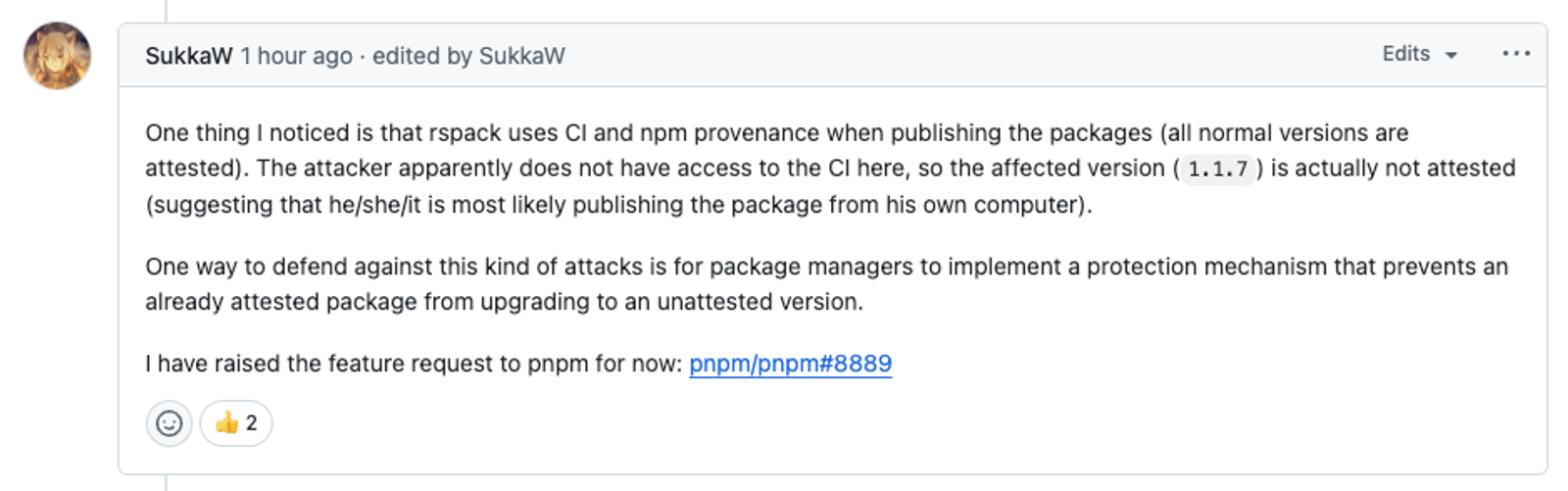 A new feature request in the pnpm GitHub repository recommends forbidding an already attested package from upgrading to an unattested version, which would potentially reduce this kind of risk since the attackers need to have access to both the npm and the GitHub in order to publish an attested malicious version. The feature request acknowledges that this could be an issue in the event that a maintainer deliberately disables npm provenance.