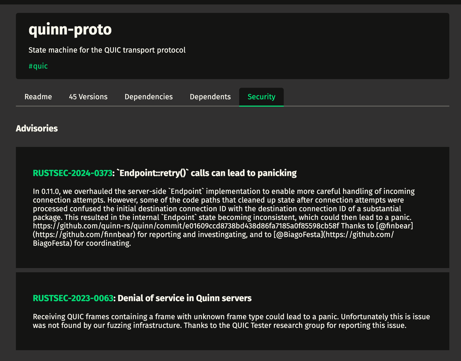 crates.io may soon get a built-in Security tab. A new Rust RFC would add a dedicated “Security” view to crate pages, surfacing known vulnerabilities and “unsound API” advisories sourced from the RustSec advisory database, maintained by the Rust Secure Code Working Group.