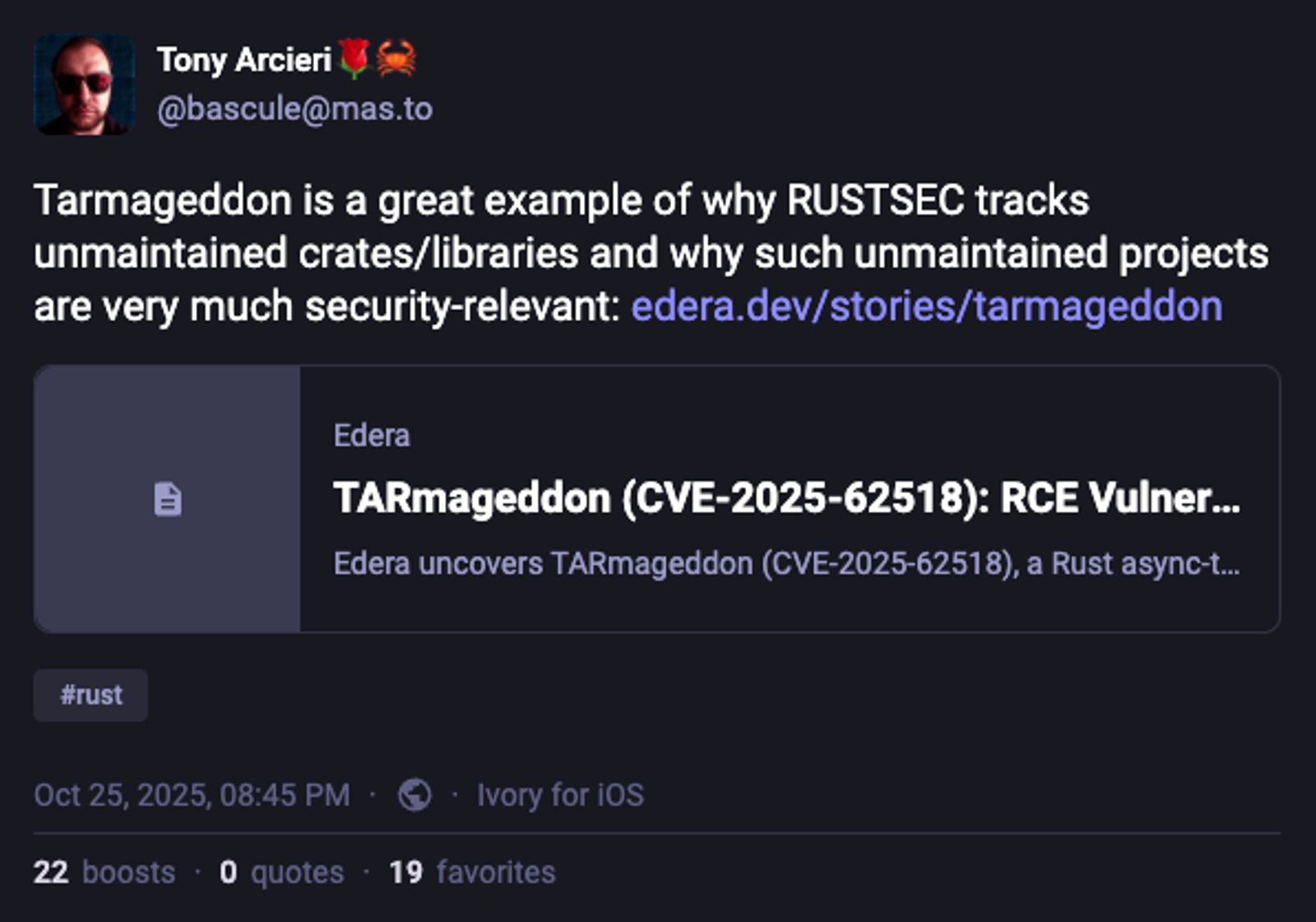 That disagreement has gotten sharper alongside real-world examples of abandonware risk. In late October, RustSec maintainer Tony Arcieri pointed to TARmageddon (CVE-2025-62518) as a case study in why widely used, unmaintained dependencies can become security incidents, linking to Edera’s write-up of the async-tar vulnerability and its ecosystem impact: RCE Vulnerability Highlights the Challenges of Open Source Abandonware. If crates.io starts surfacing RustSec advisories on crate pages, questions about how “unmaintained” is presented and contextualized will likely be one of the first places this gets contentious.