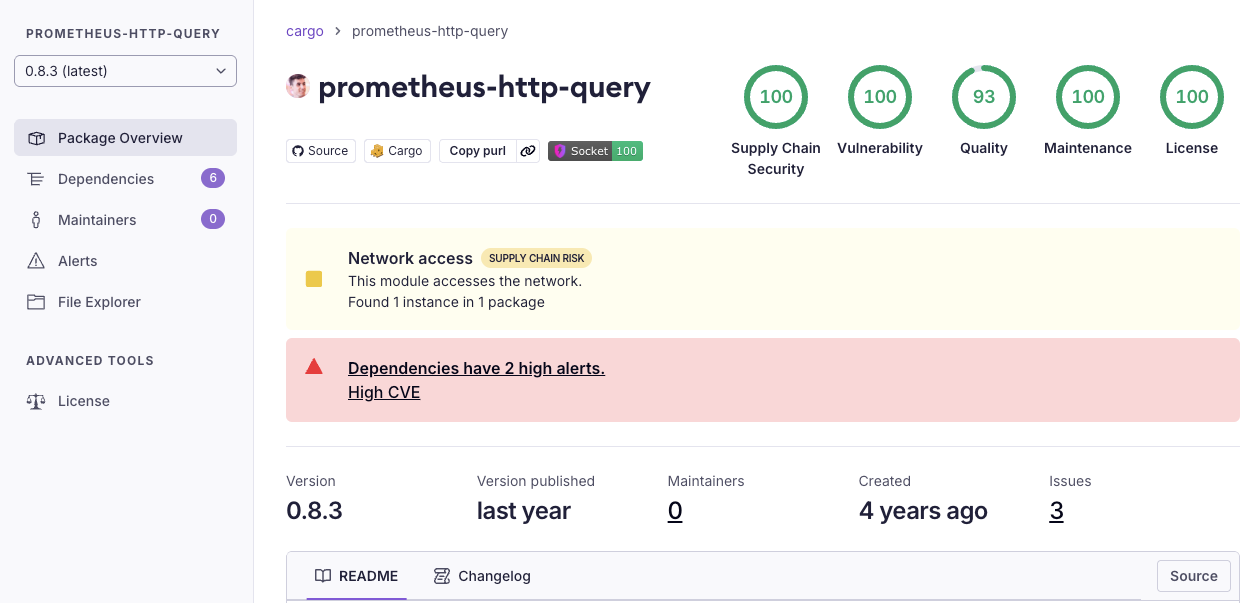 If you’re new to Socket, the platform analyzes open source dependencies for supply chain risk. For Rust projects, it reads your Cargo metadata, maps the full dependency graph, generates an SBOM, and flags behaviors that traditional SCA tools miss. With this Beta you can now scan Rust repos and review findings in the app, including the following: