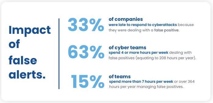 In terms of meeting reporting requirements, 68% of cyber teams surveyed said they would not be able to meet the SEC’s new 4-day disclosure rule. Roughly 1 in 3 companies reported being late to respond to cyberattacks because they were dealing with a false positive.