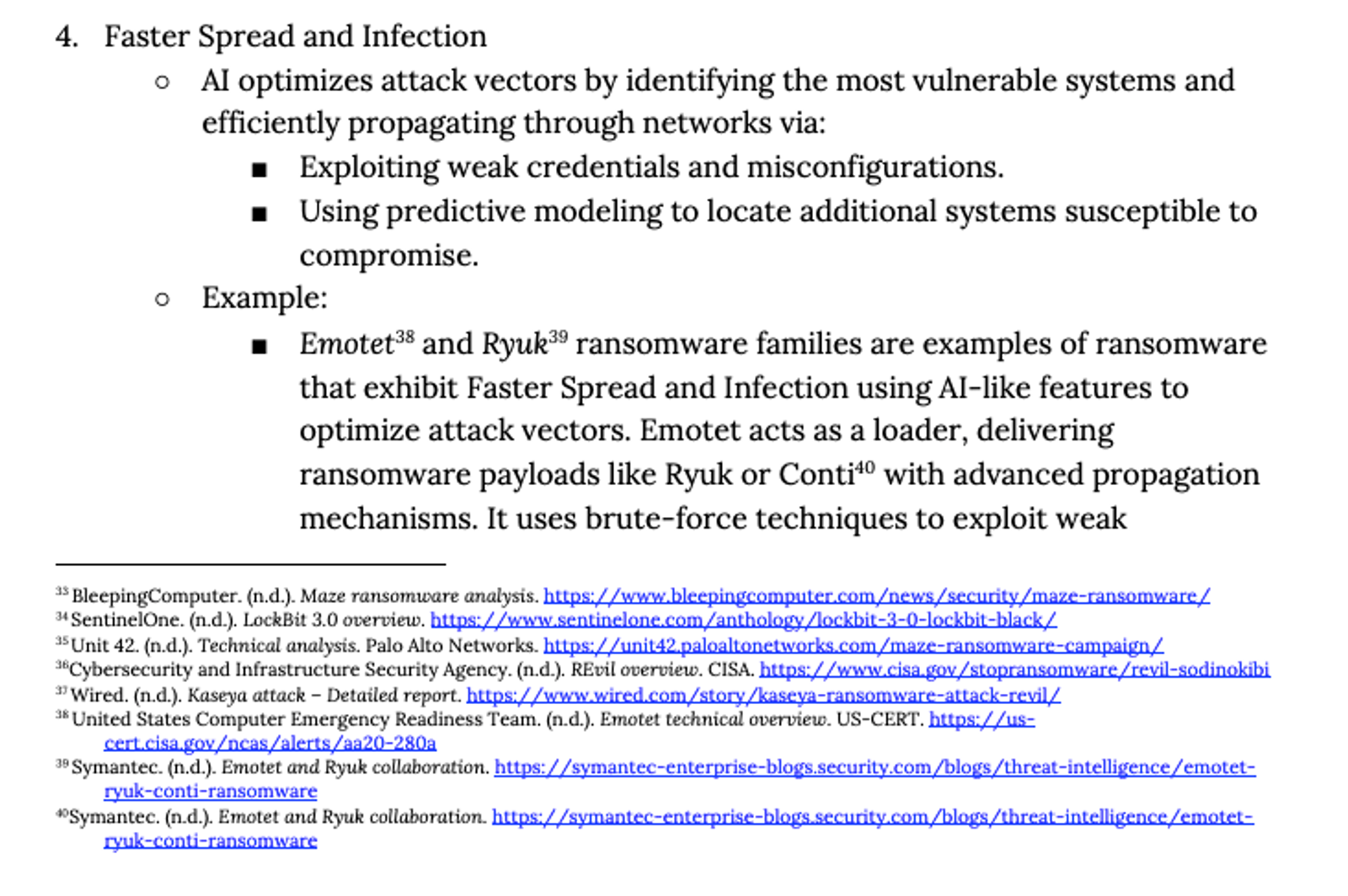 The document lists nearly every major ransomware family, including LockBit, BlackCat, and even Emotet, which was dismantled years ago, as “AI-powered.” Yet the authors provide no dataset or definition for what qualifies as “AI-enabled,” despite presenting a table claiming that 80.83% of ransomware incidents fall into that category.