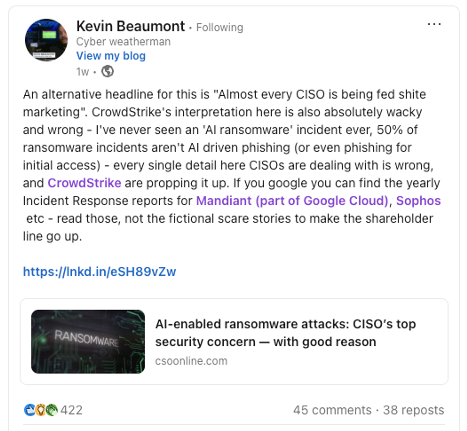 Beaumont linked to the story on LinkedIn, saying that he has “never seen an ‘AI ransomware’ incident ever.” The post drew more than 400 responses from industry professionals who questioned why so many reports equate perception with reality.
