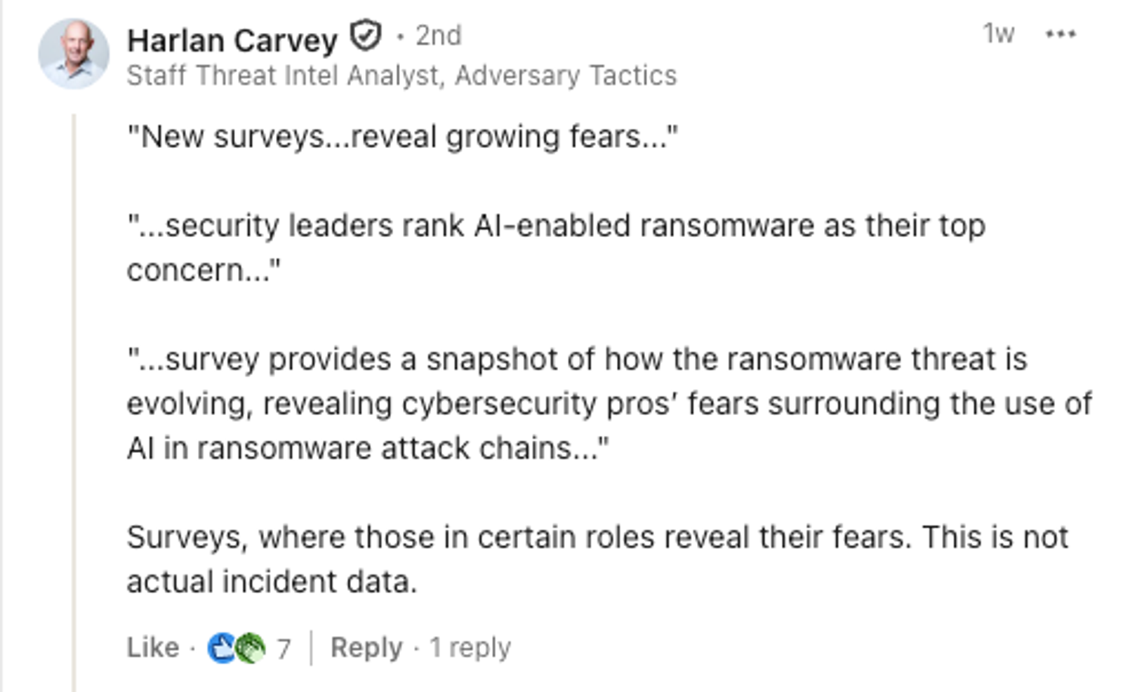 DFIR manager Steve Handy agreed, commenting, “Not a single AI ransomware event seen.” That sentiment was echoed across dozens of responses.