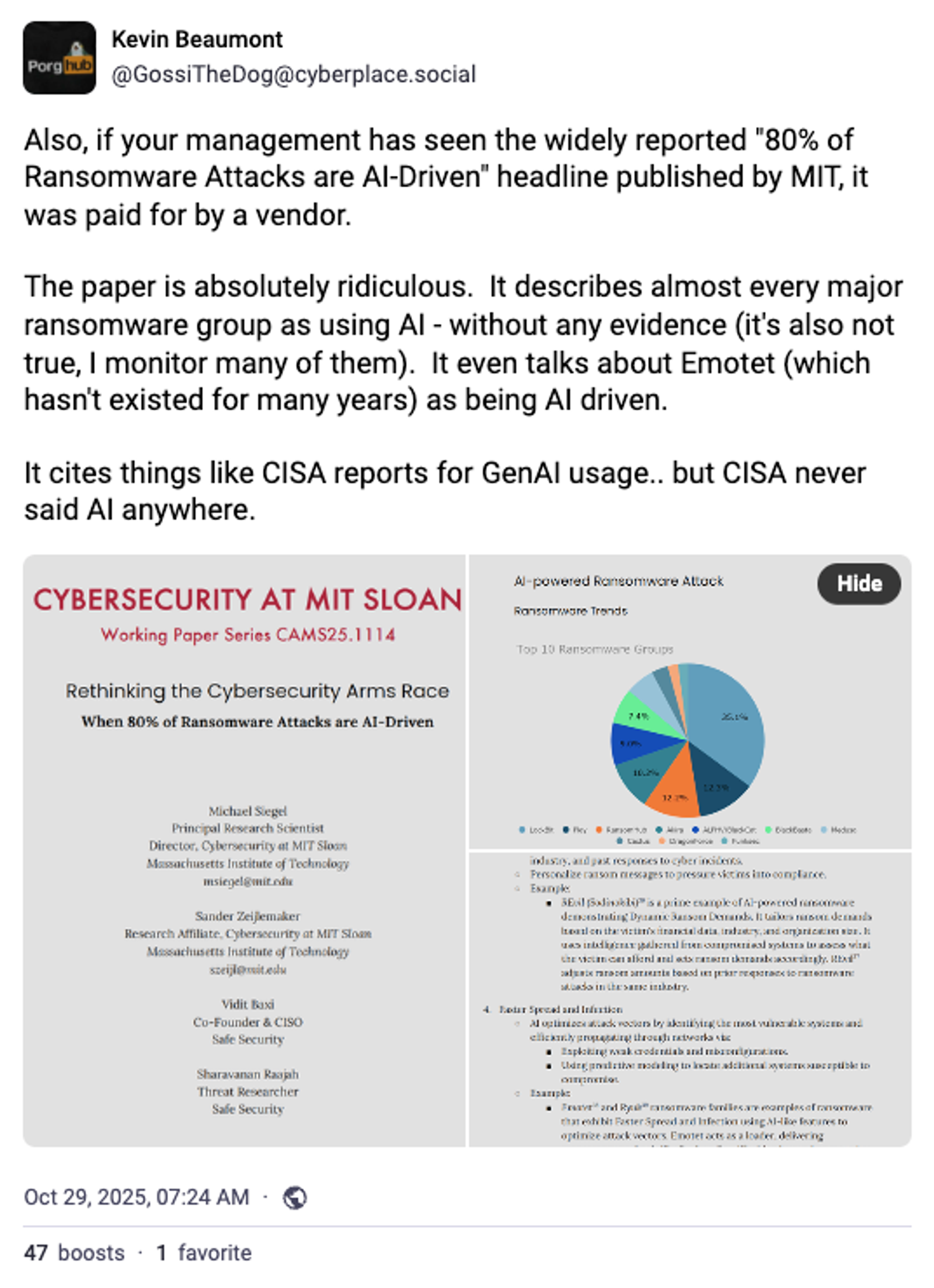 The MIT paper isn’t an isolated case. Similar claims are appearing across the security industry, often tied to surveys or marketing campaigns rather than incident data.