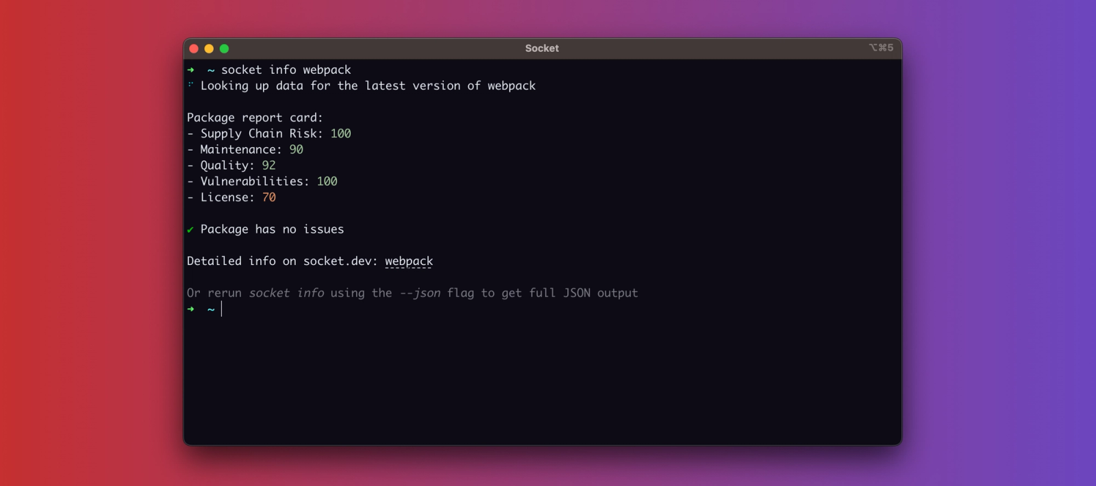In this release, we display the package's scores whenever you run the socket info command so you can easily get an idea of the security status of an npm package.