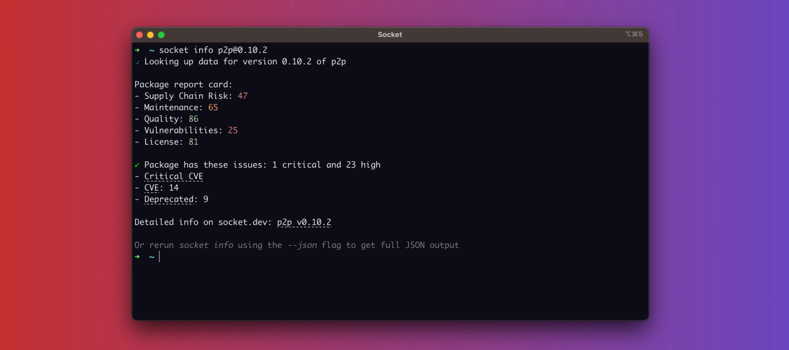 We just released v0.9.0 of the Socket CLI with some improvements to the socket info command so you can get useful information about an npm package, right in the terminal.