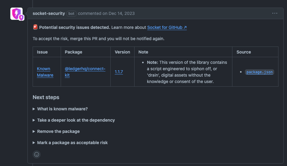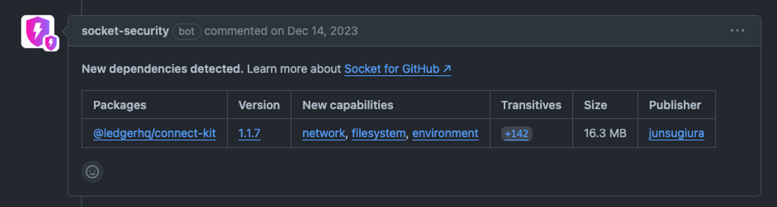 It also flags risky dependencies directly in your workflow when new or updated dependencies are detected. Socket for GitHub performs a comprehensive analysis of the packages and informs developers about the risks.