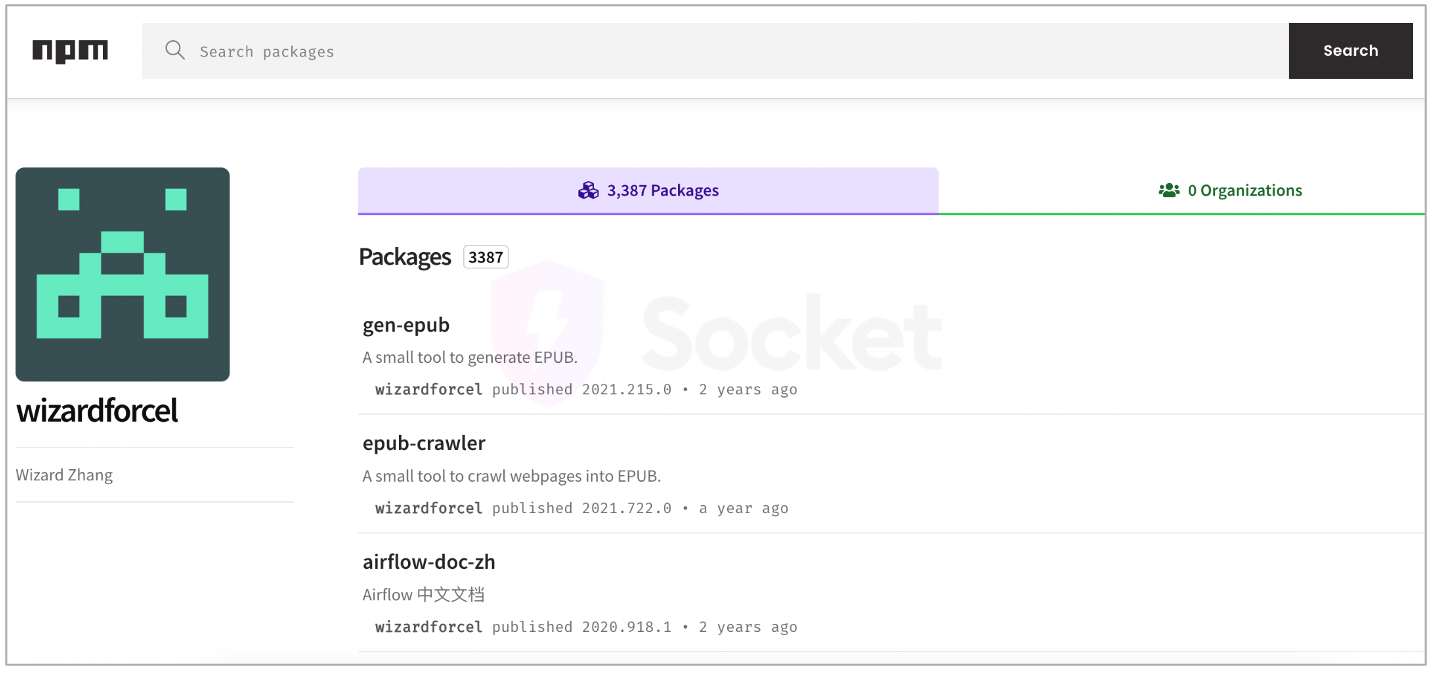 We further noticed the maintainer of the package ('wizardforcel') had published upwards of 2,900 identical packages. As of Tuesday, November 1st this count jumped up to 3,387.