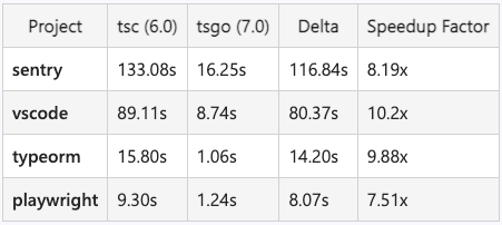 The team shared benchmarks that show TypeScript 7 is ~7.5 to ~10x faster full builds: