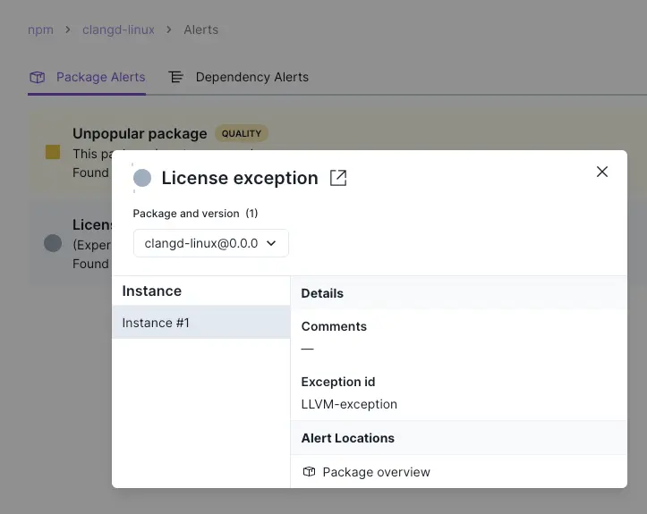 Because of these potential complications, Socket’s License Exception Alert helps you spot exceptions in your dependencies before they cause an issue down the road. The alert identifies which exception is in play and the location of the file.