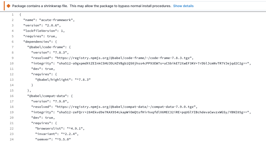 While the shrinkwrap file wasn’t created with bad intentions, it essentially lets you completely bypass all normal dependency installation rules. It’s also not caught by most SCA tools. Shrinkwrapping allows a package to install any unsigned code from any host and also override any transitive dependency in your tree.