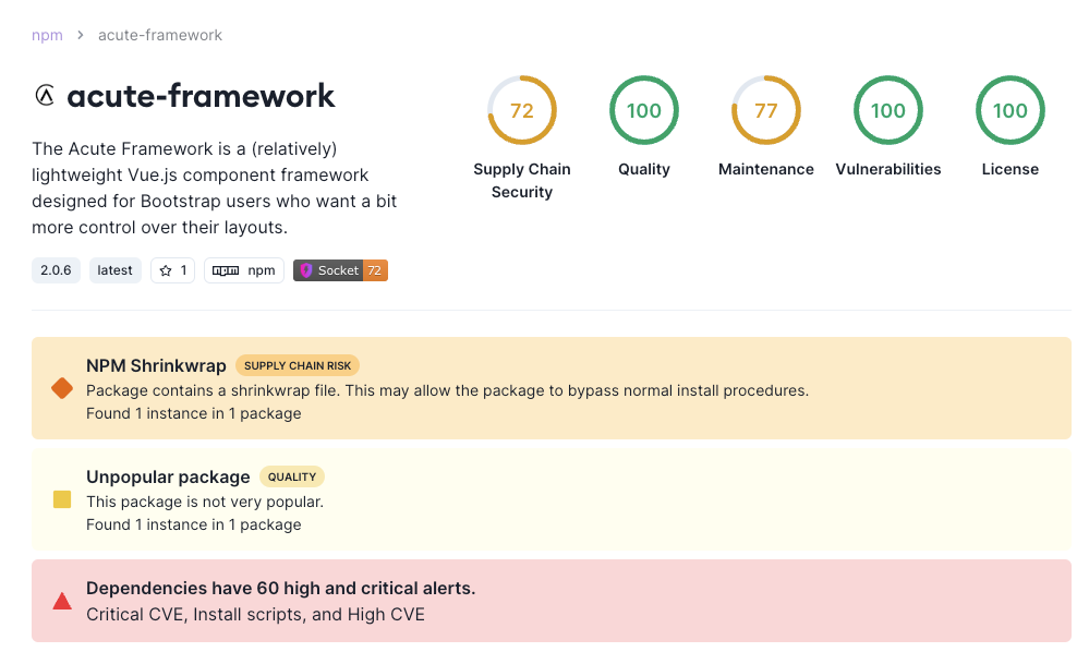 If you're not already using Socket, the fastest way to check for npm shrinkwrap files in your dependencies is to install our free GitHub app. It's a two-click install and will detect shrinkwrapped packages, as well as 60+ other supply chain risks.