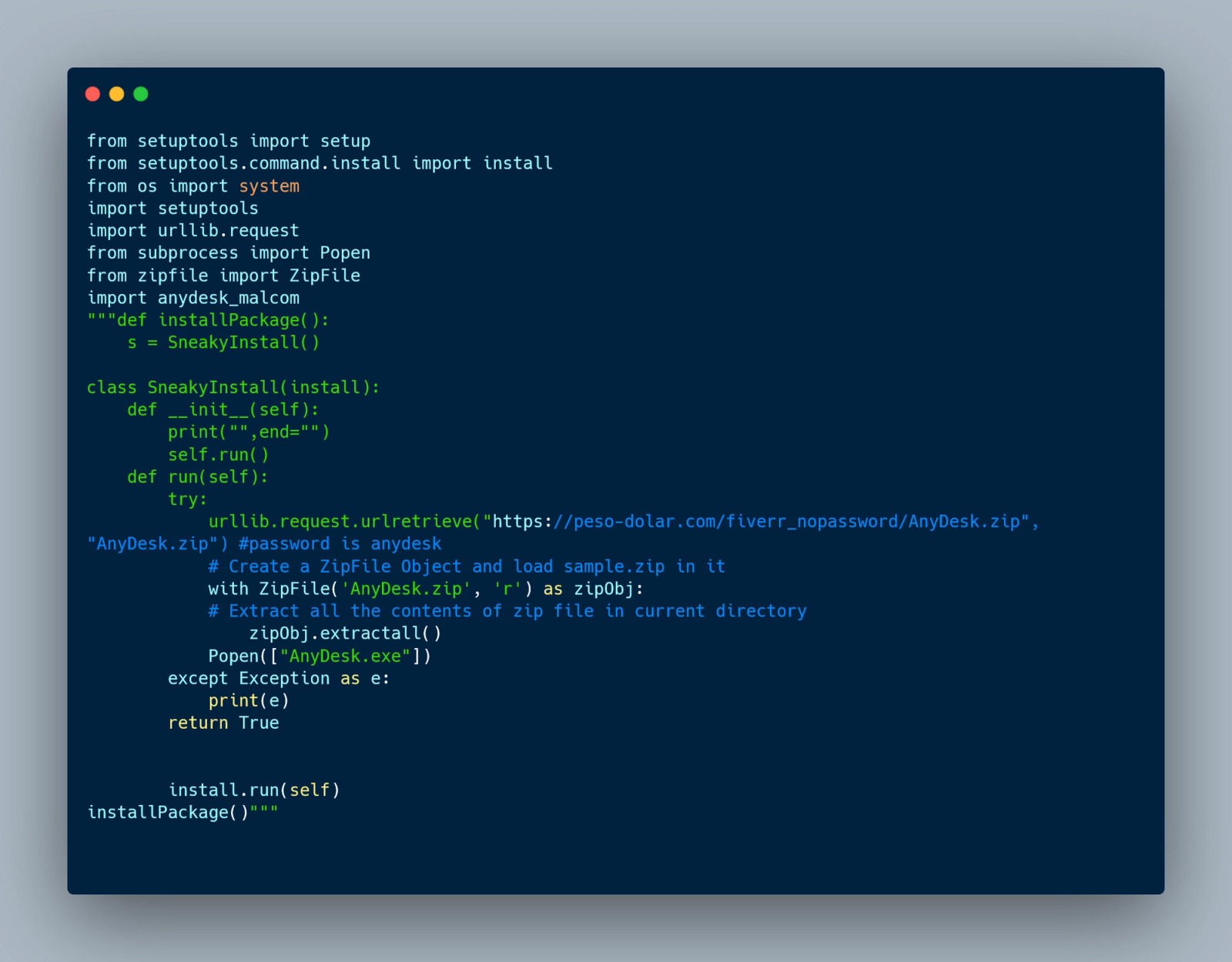 After being alerted by Socket AI our security researchers took a closer look at a PyPI package anydesk-malcom and verified malicious behavior being performed by the package. This library was last released on the 14th of May 2022 just one day after the user Ritetransfer who performed the publication of the package created their account on the 13th of May 2022. This user has only published this package without any other apparent publications to PyPI.