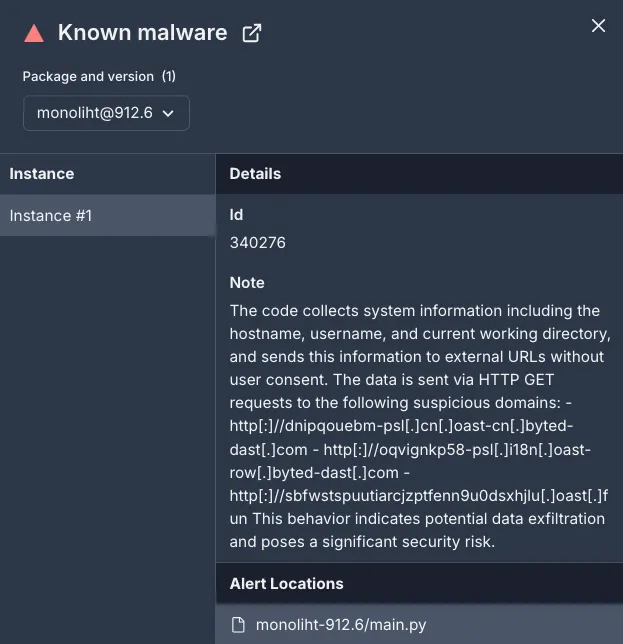 By reversing a single letter, the threat actor created a package monoliht that closely resembles the legitimate library monolith. The domains within the malicious script are used to silently collect metadata such as the victim’s hostname, username, and current working directory.