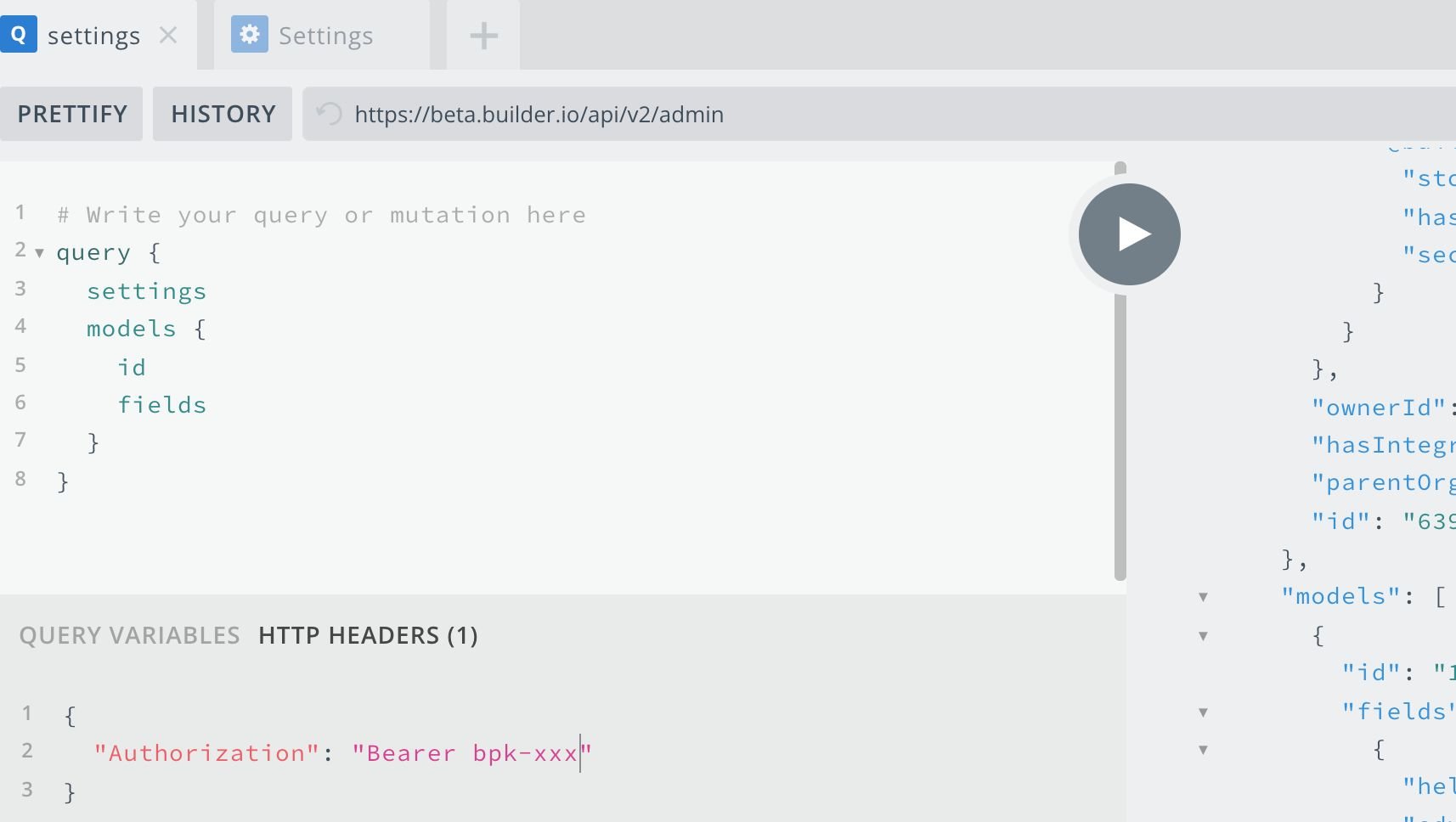 - check the graphiql explorer on beta.builder.io/api/v2/admin, add your private key to the http headers section and inspect available queries / mutations: