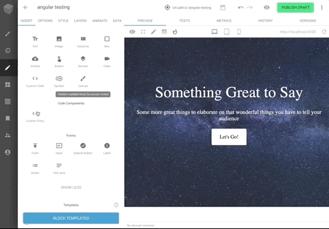 You can drag and drop to add your Angular components in the Builder editor with a minimal tag like below: