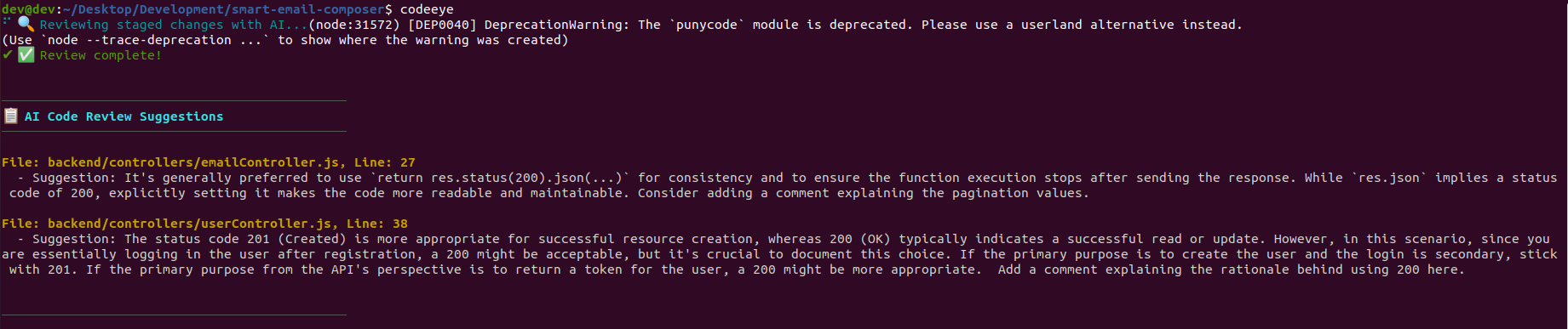 Codeeye is an open-source JavaScript/Node.js package published on NPM that uses AI to review your Git staged changes.