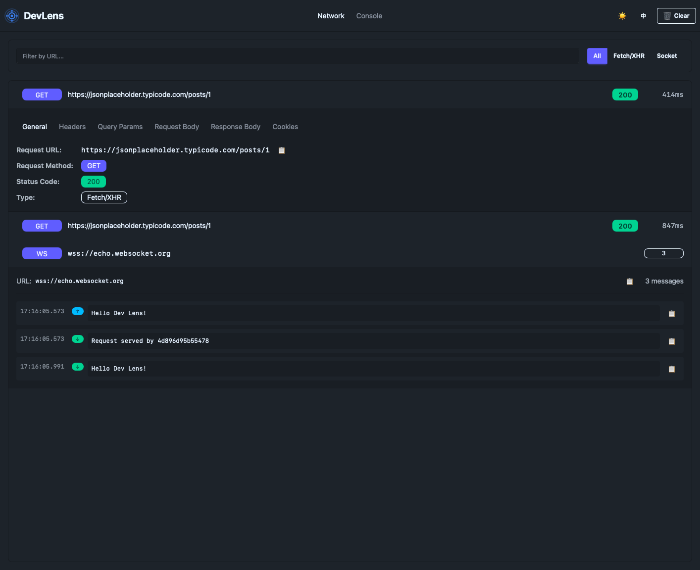 Launch the Dev Lens desktop app, and you'll see all network requests and console logs in real-time!