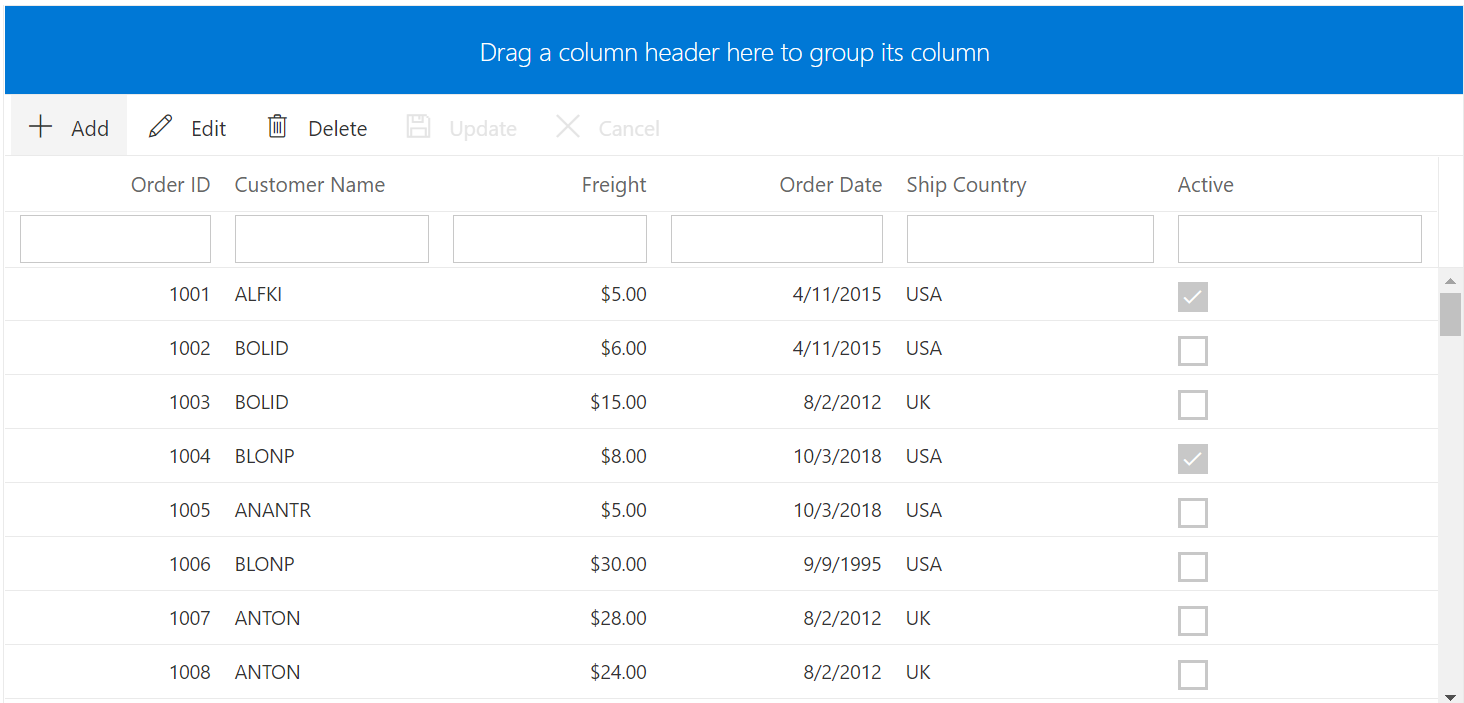 This package contains the Blazor DataGrid Component for Blazor application. The Syncfusion Blazor DataGrid component is used to display and manipulate tabular data with configuration options to control the way the data is presented. It can pull data from data sources such as IEnumerable objects, OData web services, or DataManager and binding data fields to columns. It also displays the column header to identify the field with support for grouped records.The most important features available in the datagrid component are paging, sorting, filtering, searching, and grouping.