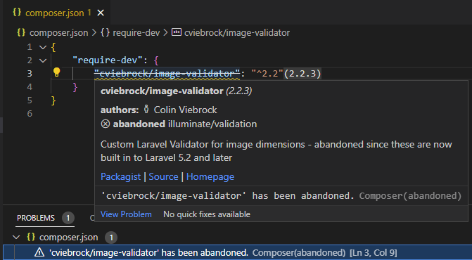 Composer "All-in-One" provides seamless Composer and Packagist integration in Visual Studio Code. Run Composer commands, leverage advanced IntelliSense for composer.json, access code lenses and quick actions, use schema validation, search packages, get abandoned package warnings, run/manage Composer scripts and much more.