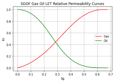 >>> df = simtools.rel_perm_table(rows=25, krtable='SGOF', krfamily='LET', kromax =1, krgmax =1, swc =0.2, sorg =0.15, Lo=2.5, Eo = 1.25, To = 1.75, Lg = 1.2, Eg = 1.5, Tg = 2.0)
